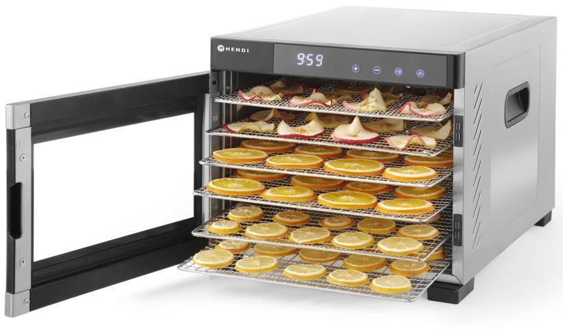 - Тихі вентилятори розподіляють гаряче повітря, забезпечуючи рівномірну сушку продуктів без потреби перевертання полок